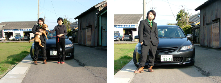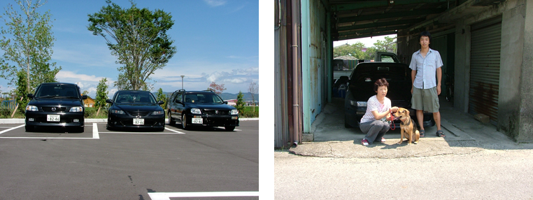 - パパ デミオ、弟 マツダ アテンザワゴン、兄 日産ステージヤ、もん太も一緒に。